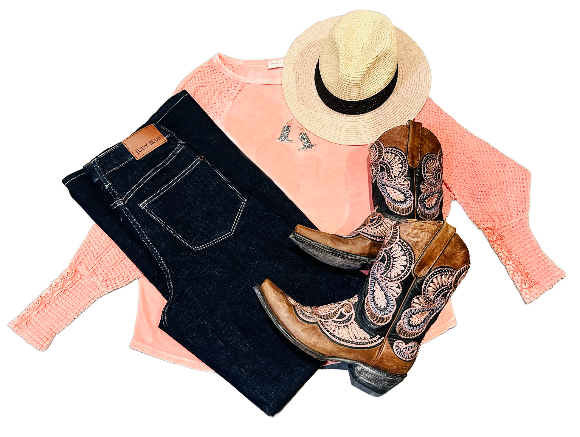Be a beautiful belle in our Beautiful Girl dolman. The boat neck, lace cuffs, and waffle knit sleeves are sweet and stylish, while the terry knit bodice provides cozy comfort. Dive into the coral color, and feel fabulous!
