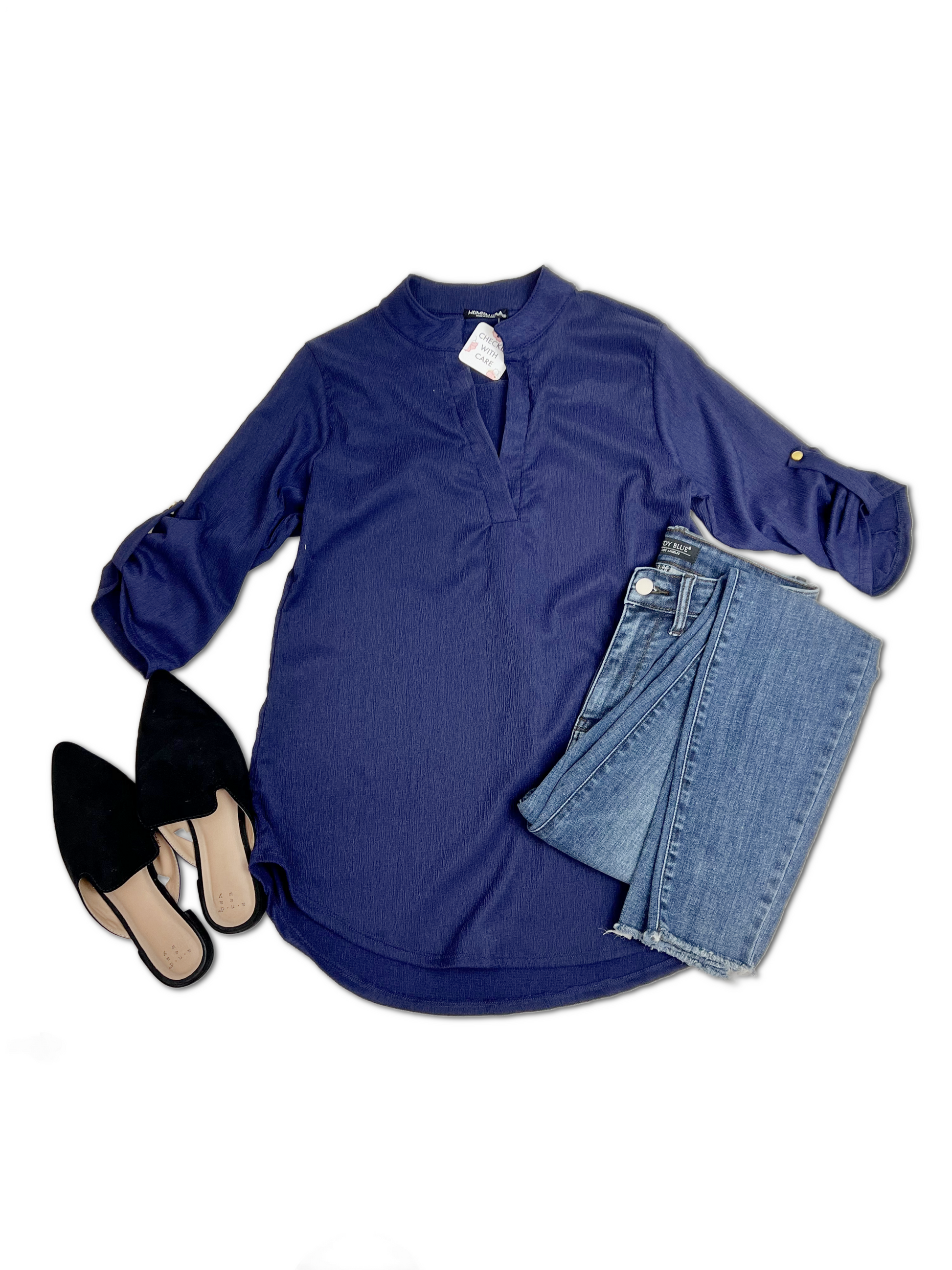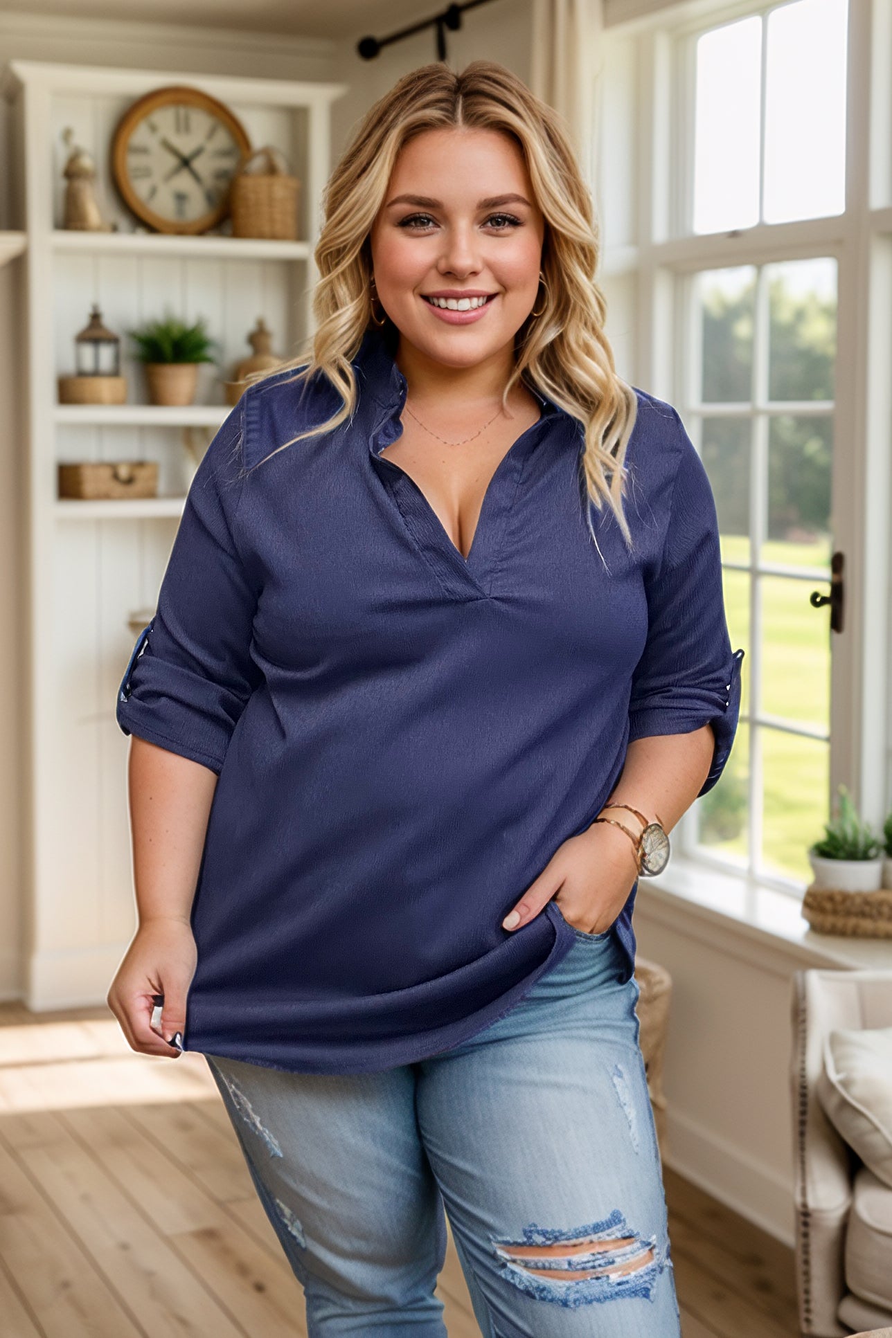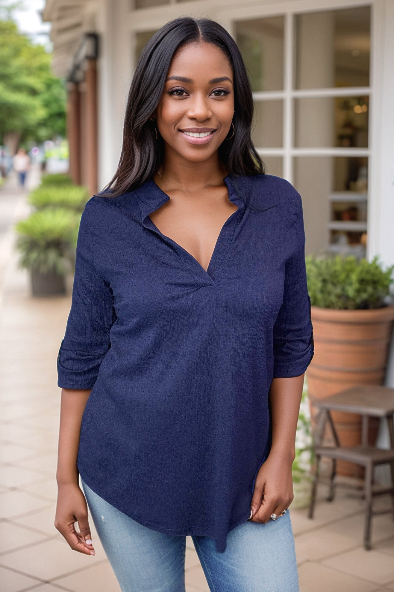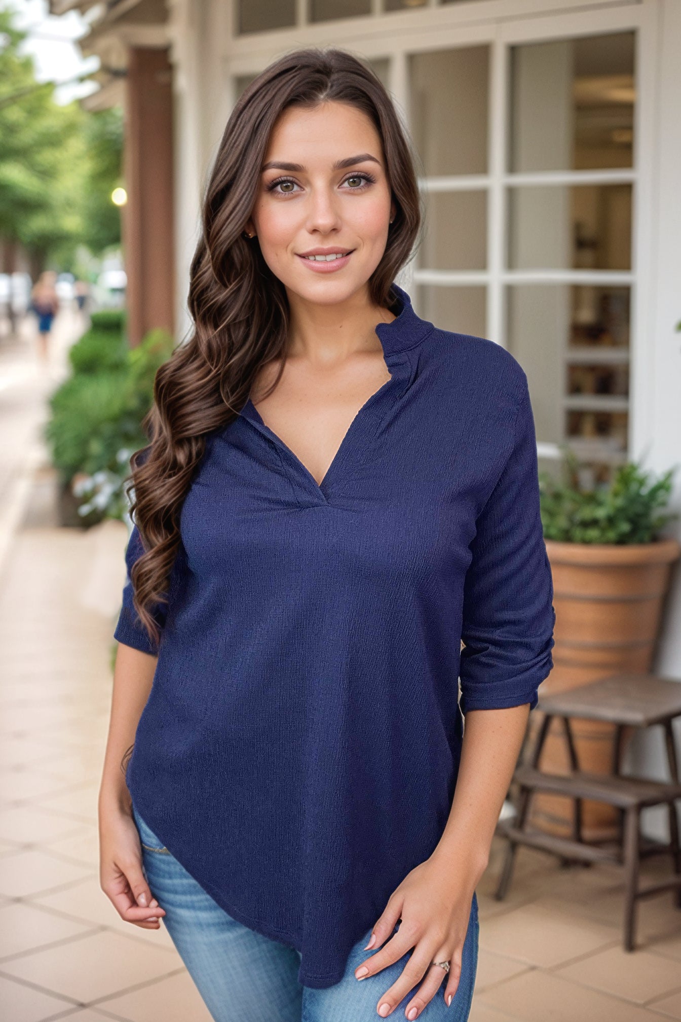 Get ready to rock this Gabby top from Blueberry Hill! With a v-neck and three quarter sleeves, this textured top features a bold mandarin collar and shiny gold button details. Stand out from the crowd in style and comfort!