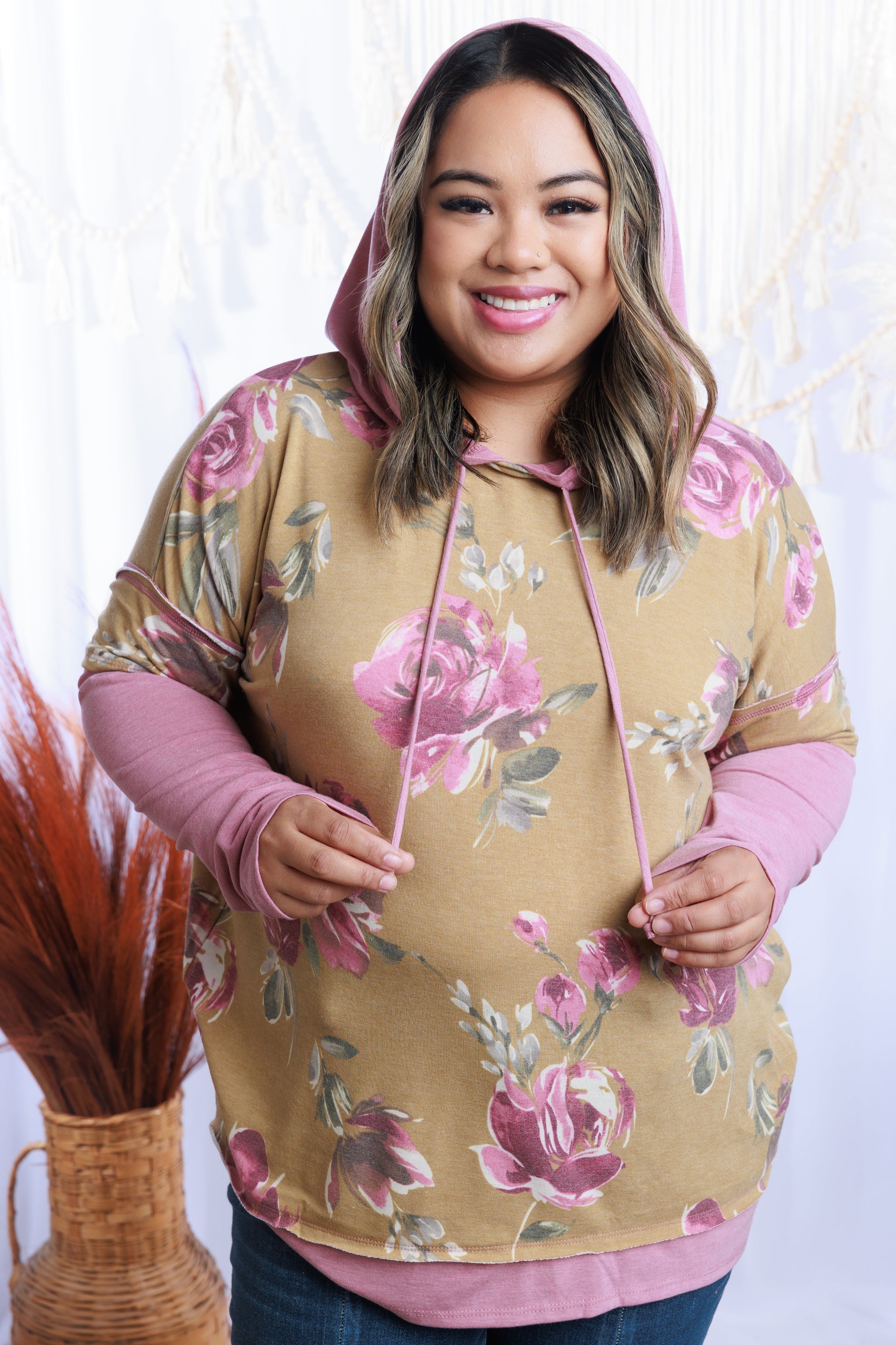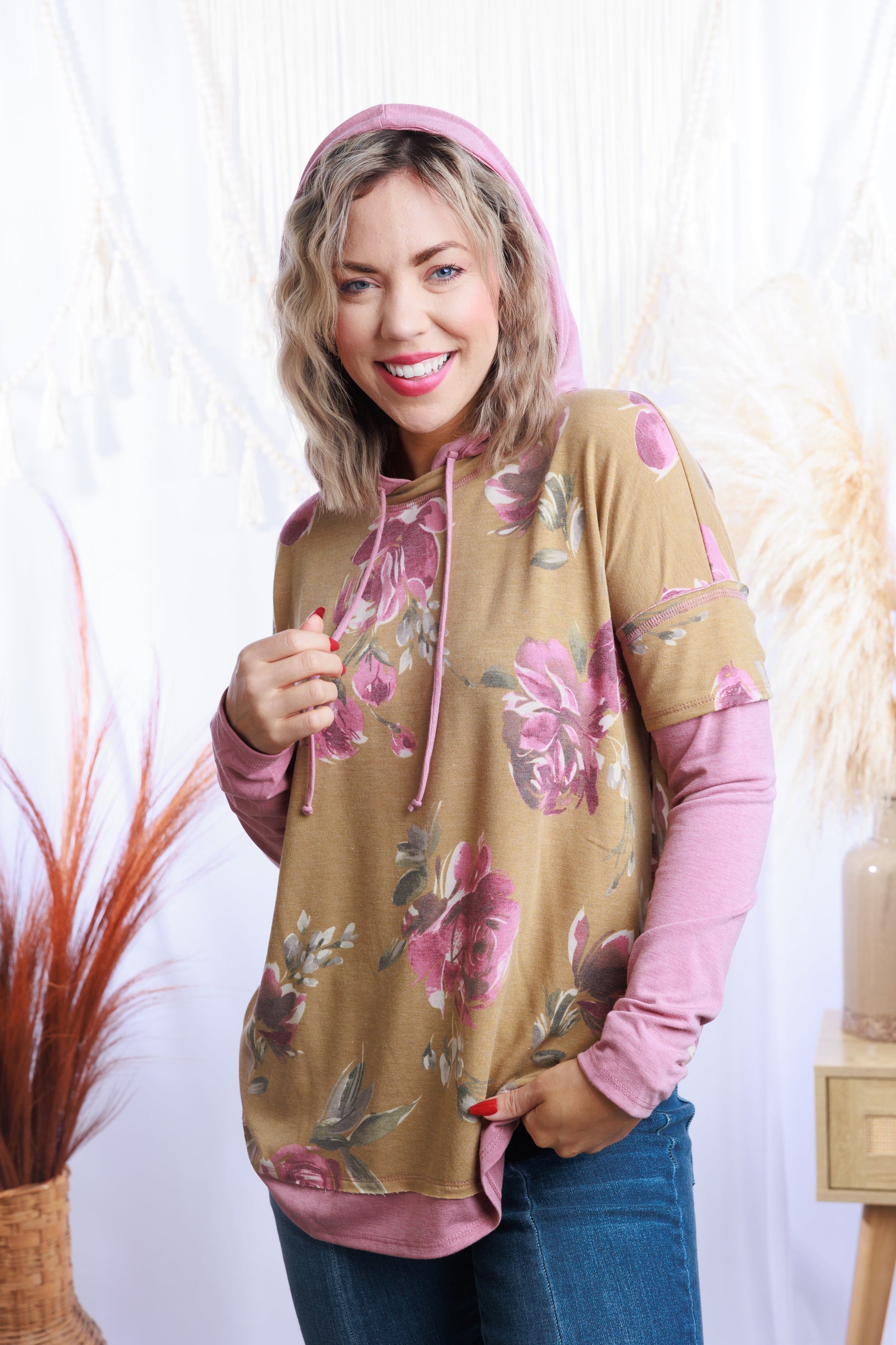 Stay comfy and look cool this season with the Cheerful Days Hoodie. Featuring a mustard and pink floral print with reverse stitch details and contrast sleeves, this hoodie is sure to make a statement! Throw on the drawstring hoodie and get ready for cheerful days ahead.