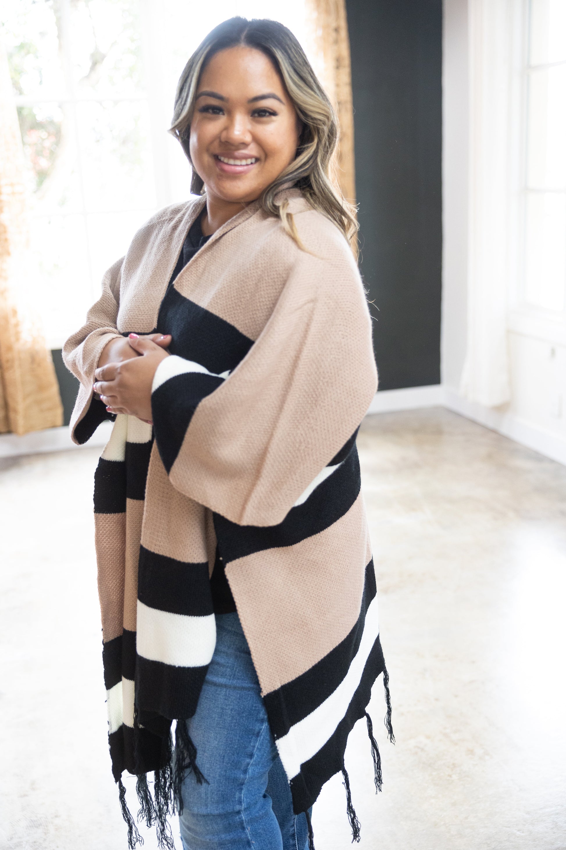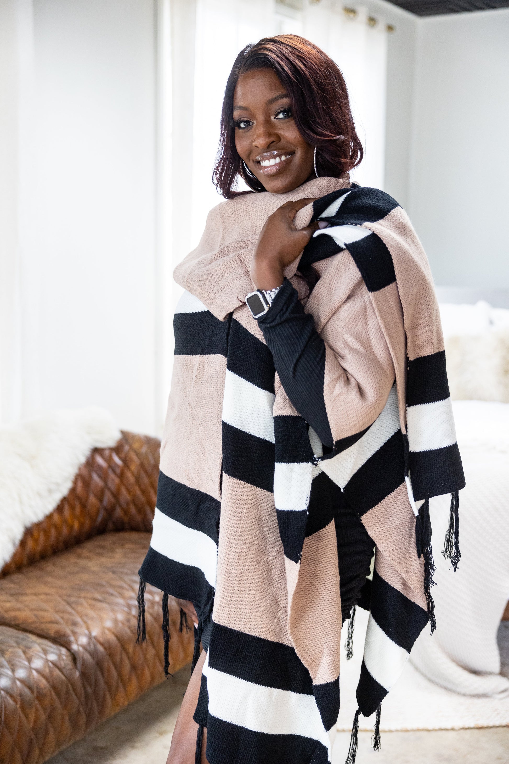 Make the world do a double take with this poncho! It's perfect to wear over just about anything! Frayed at the bottom for extra double takes & rust color blocked stripes with two sets of black stripes surrounding two individual white stripes on the front, with similar or near identical back details.