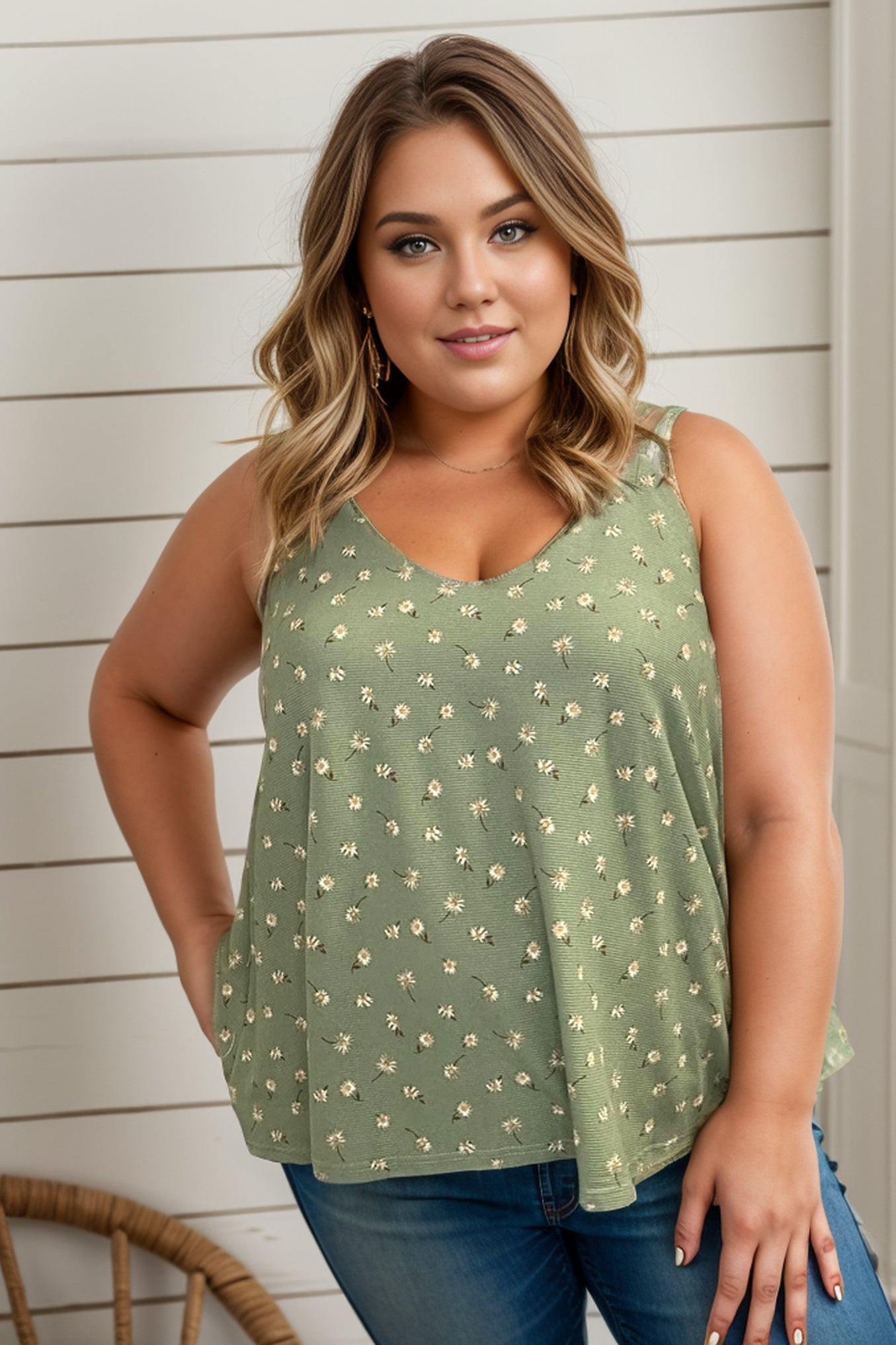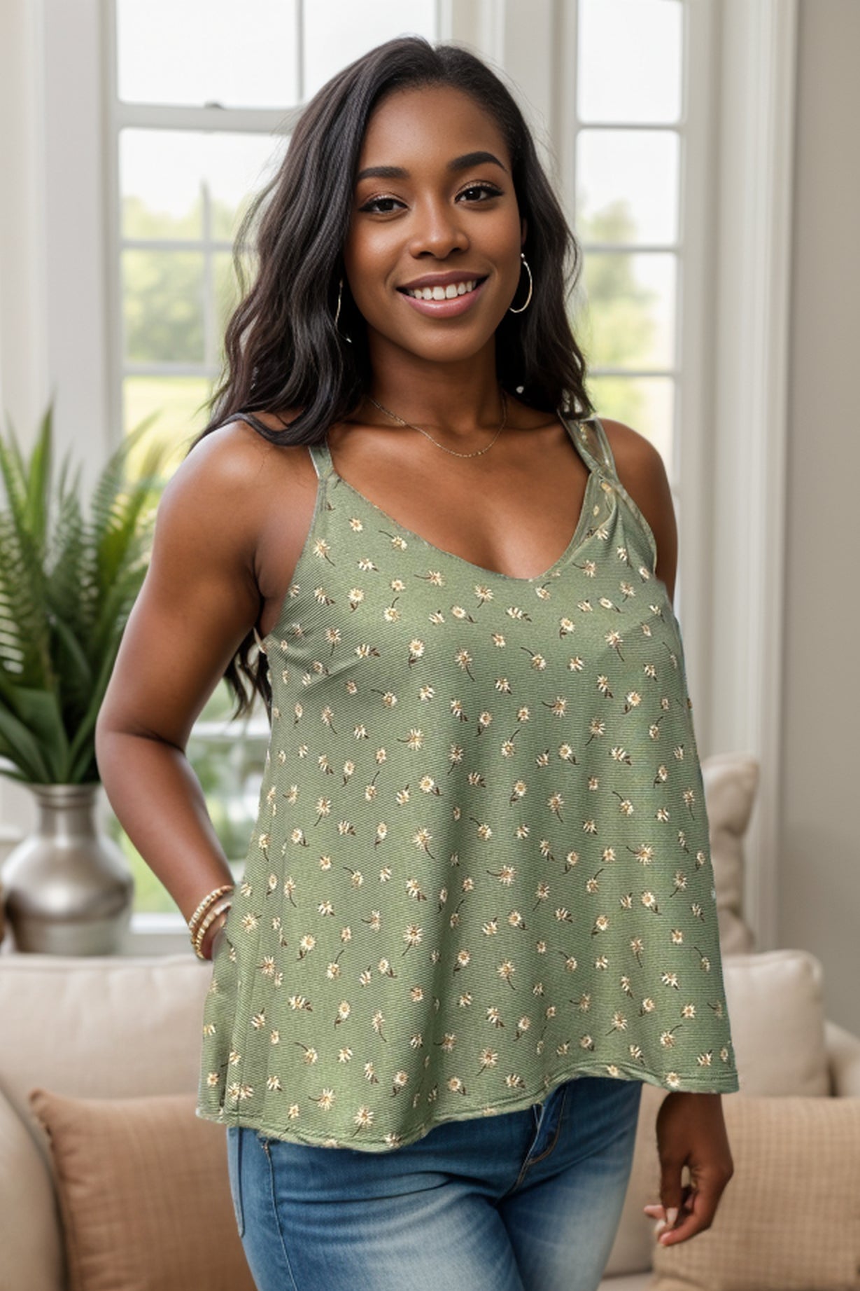 Introducing the Daisy Marie Tank! Enjoy a relaxed fit and playful daisy print while showing off your unique style with double spaghetti straps and a back criss cross detail. Perfect for any fun-loving, fashion-forward individual.