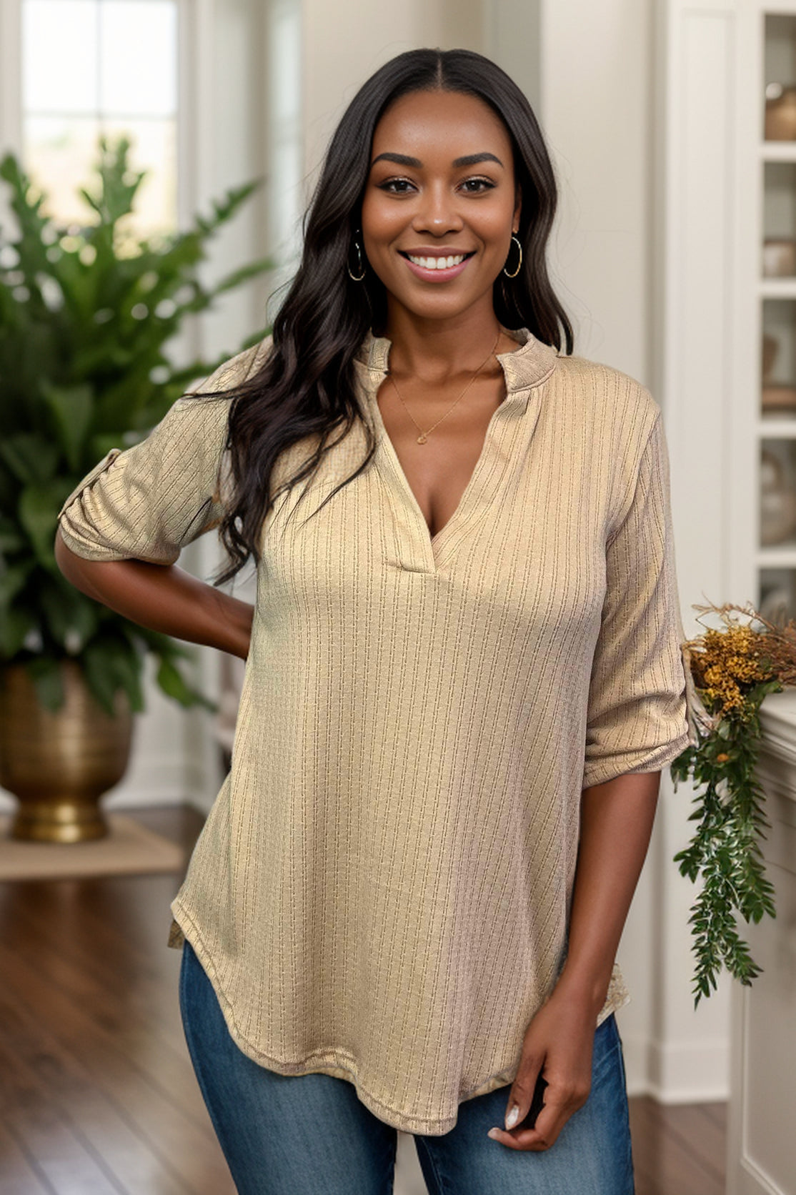 Get ready for days like no other in our Days Like This Gabby! Featuring a roll-up 3/4 sleeve, v-neck, and mandarin collar, this solid colored top will add a touch of style to any ensemble. Perfect for a fun night out!