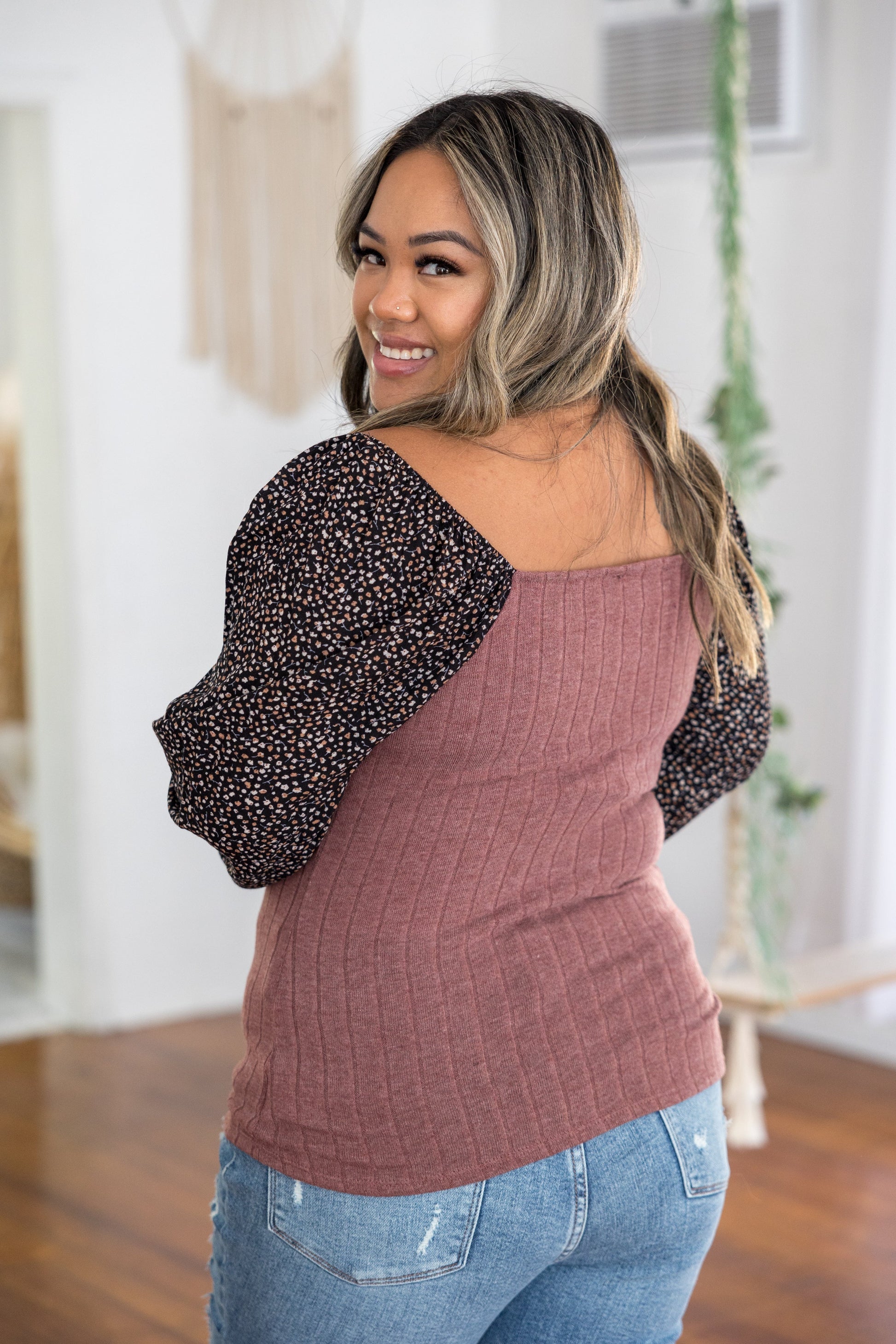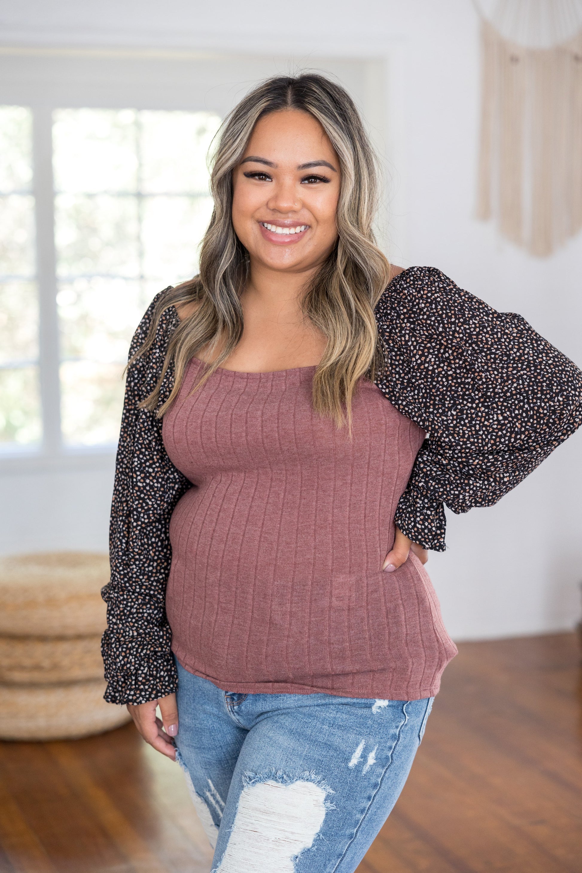 This long sleeve top is just like a dream come true. With a fitted silhouette, this top features a square neckline, long balloon sleeves with ruffle detail and rounded hem.