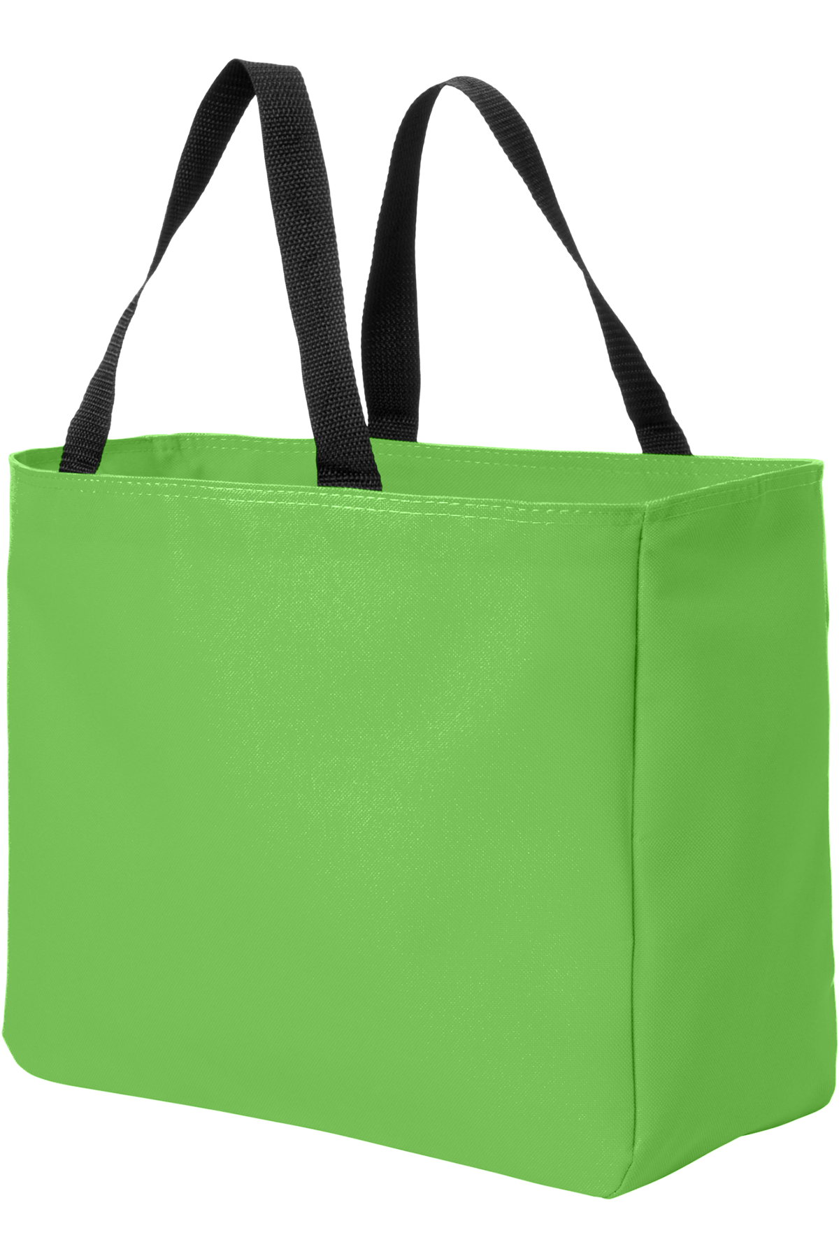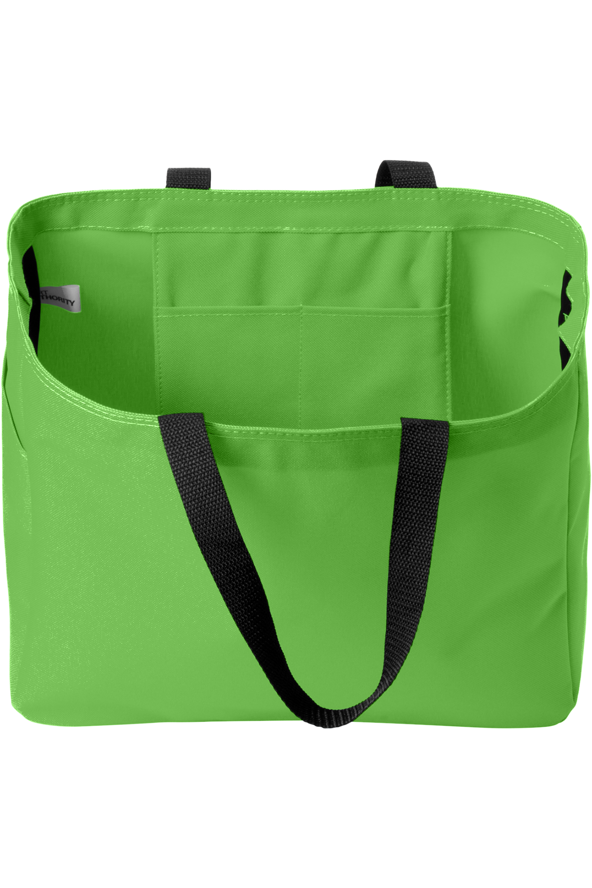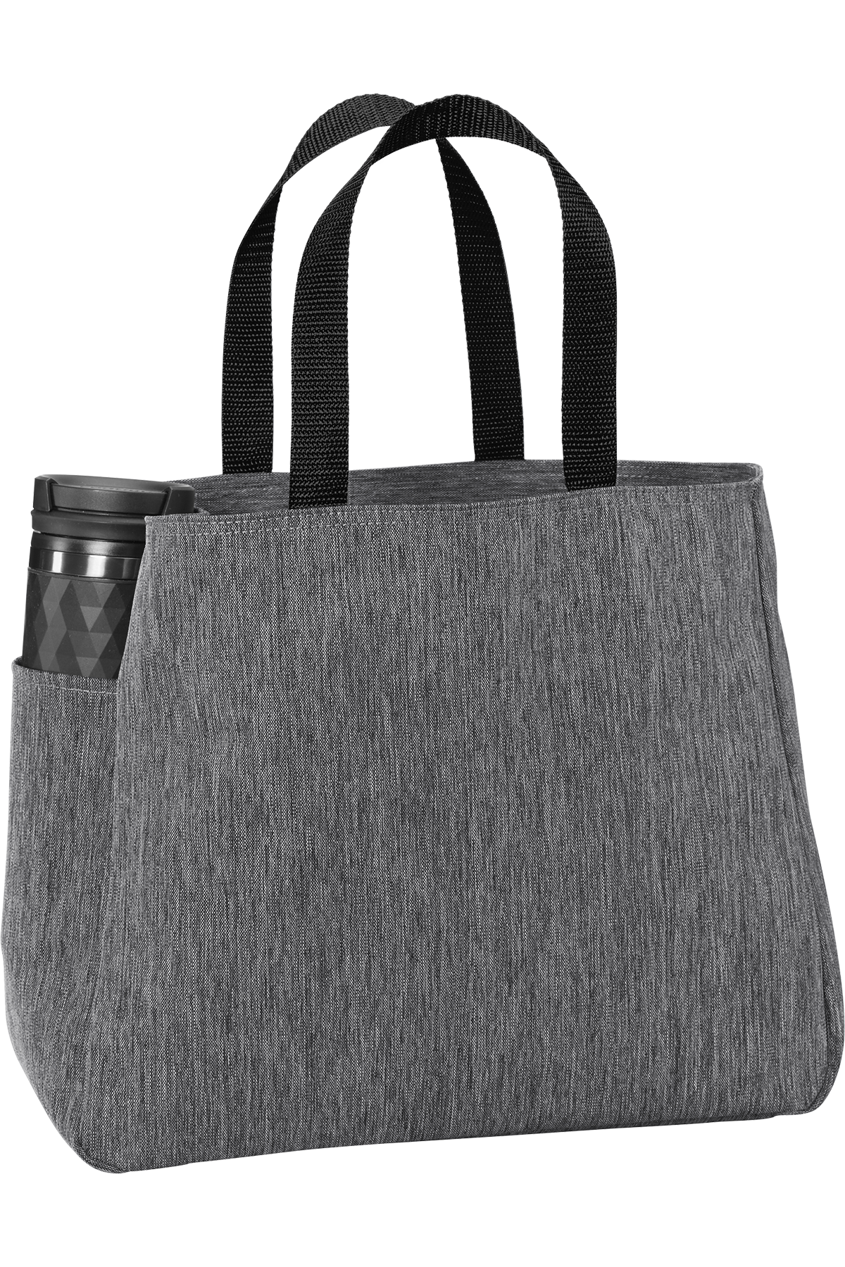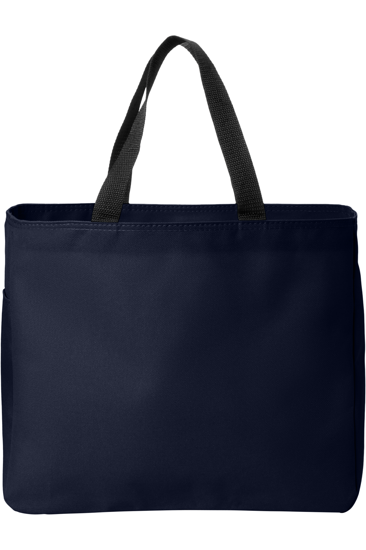 This durable Port Authority Tote comes in a wide assortment of colors. Dimensions are 12" h x 12" w x 6.5" d with an exterior side pocket and small interior pockets to help keep you organized. This is an embroidery-able item so let us know if you want to upgrade with a monogram!