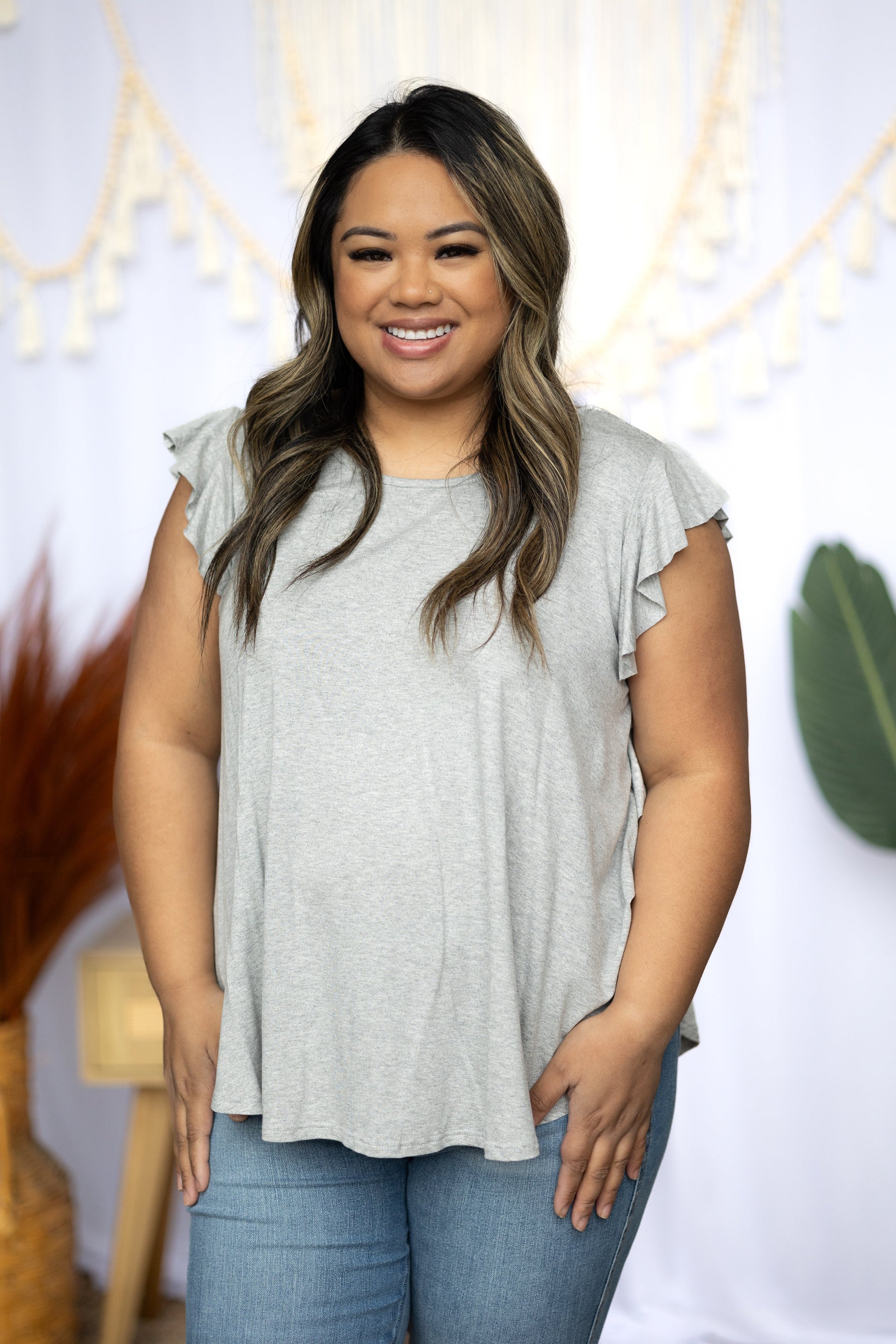 Lend your wardrobe a cool, breezy touch with the "Flutter By" top! Perfect for summer days, its lightweight design and relaxed fit keeps things comfy, while the ruffle sleeve and dolphin hem give it flair - perfect for making a statement without trying too hard. Ready to ruffle some feathers?