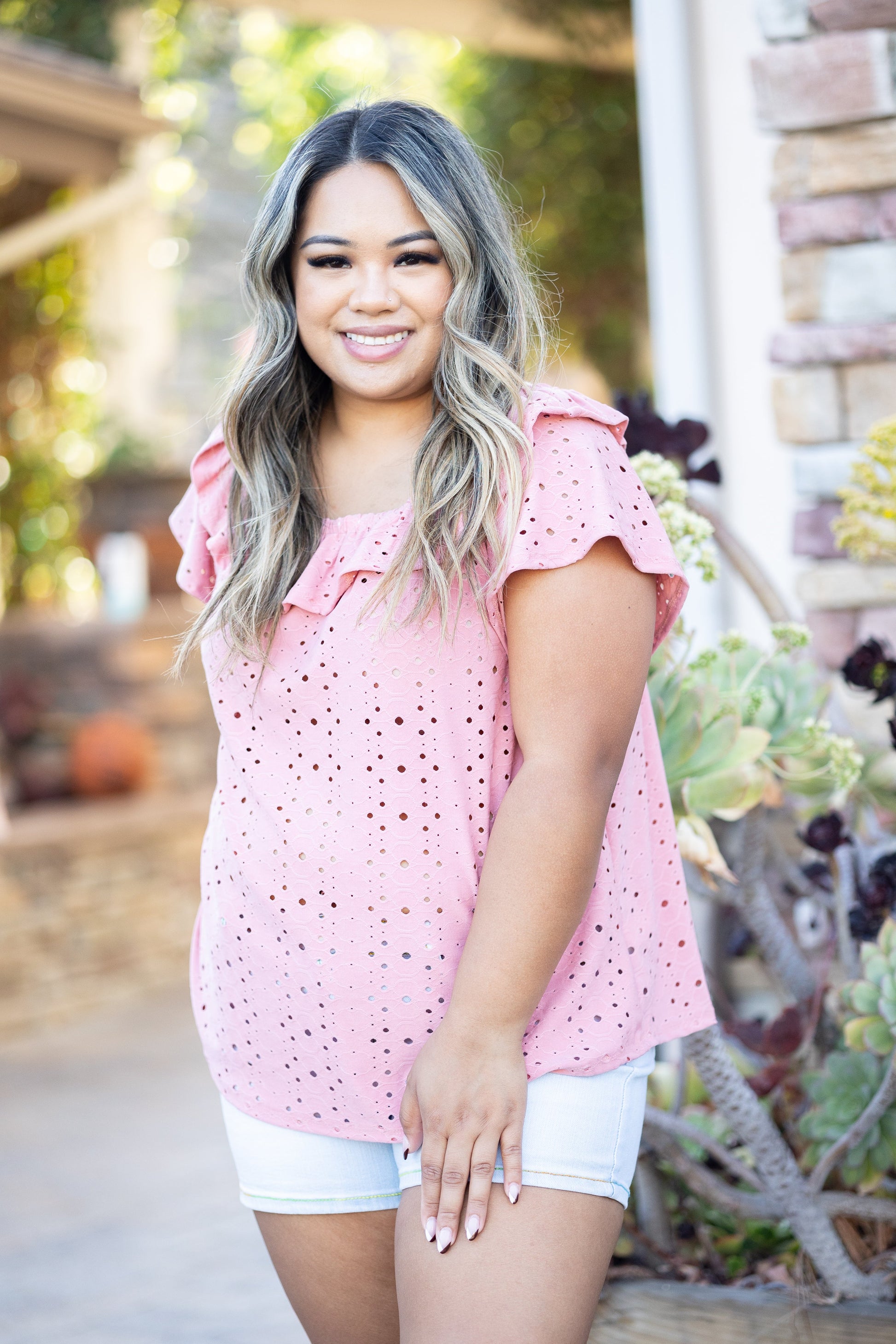 This eyelet top will absolutely steal your heart. Not is it stunning, but it also offers amazing stretch which is really unique to eyelet tops. With a relaxed fit, this top features short sleeves, a boat neck with ruffle trim and rounded hem.