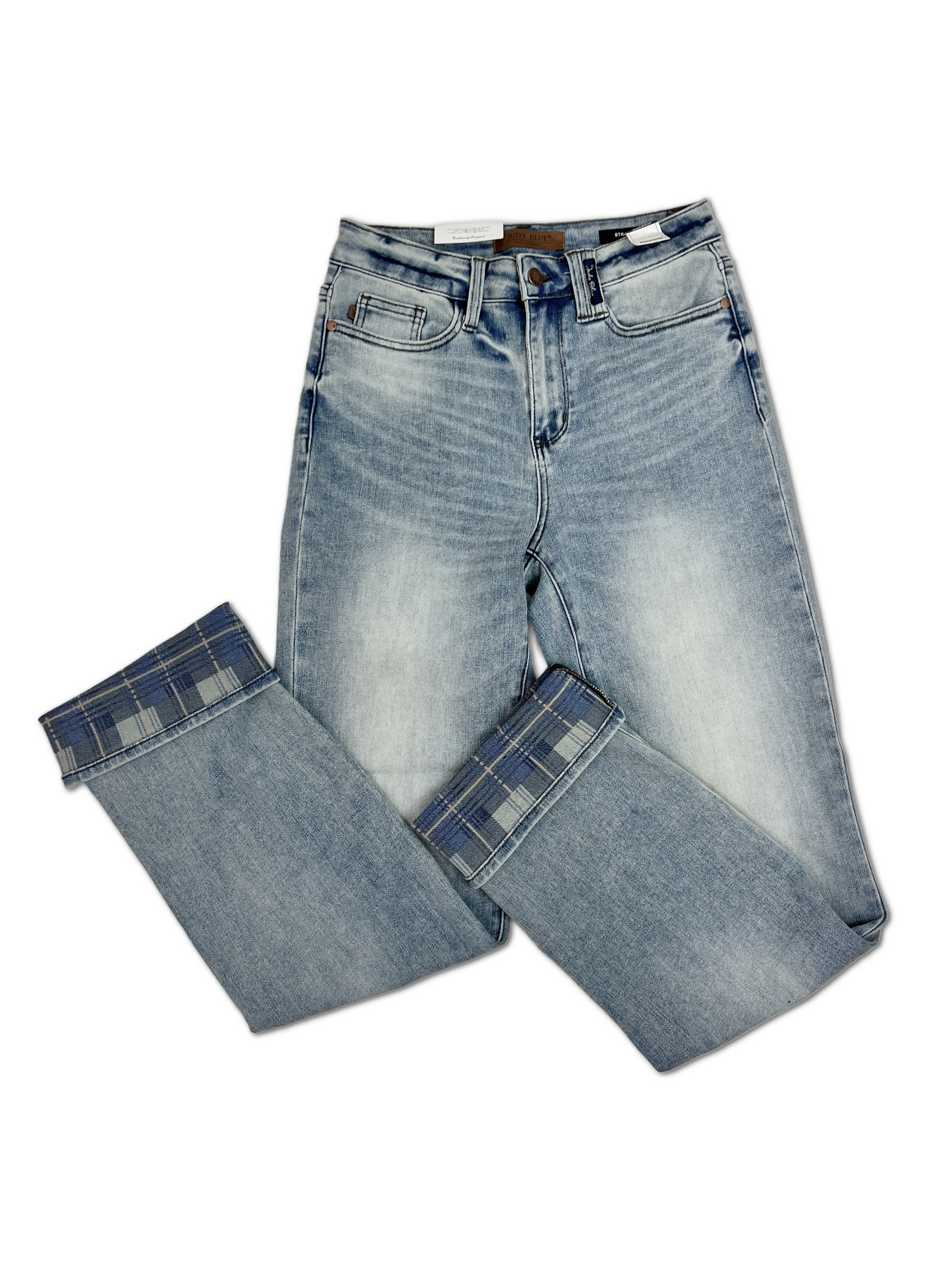 Rock your next look with these fabulously fashionable Judy Blue Jeans! They have an amazing stretch and high waist design to keep you comfy all day, plus a vintage wash and bold plaid cuff for a stylish pop of color. Cuff 'em or uncuff 'em - they're a surefire style hit, no matter what you choose!