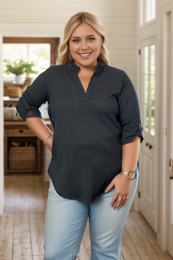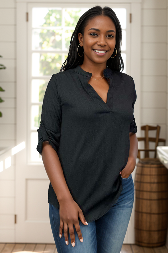 Get ready for nights like no other in our Nights Like This Top! Featuring a roll-up 3/4 sleeve, v-neck, and mandarin collar, this solid colored top will add a touch of style to any ensemble. Perfect for a fun night out!