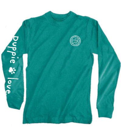 Puppie Love Long Sleeve Tee with front, back and right arm designs. Design is screen printed on Adult Delta brand in a multi season color of Jade.