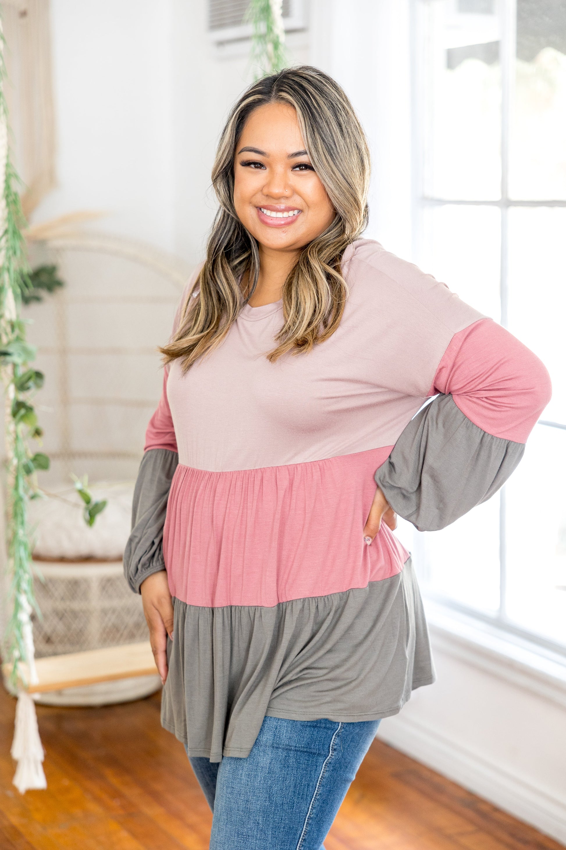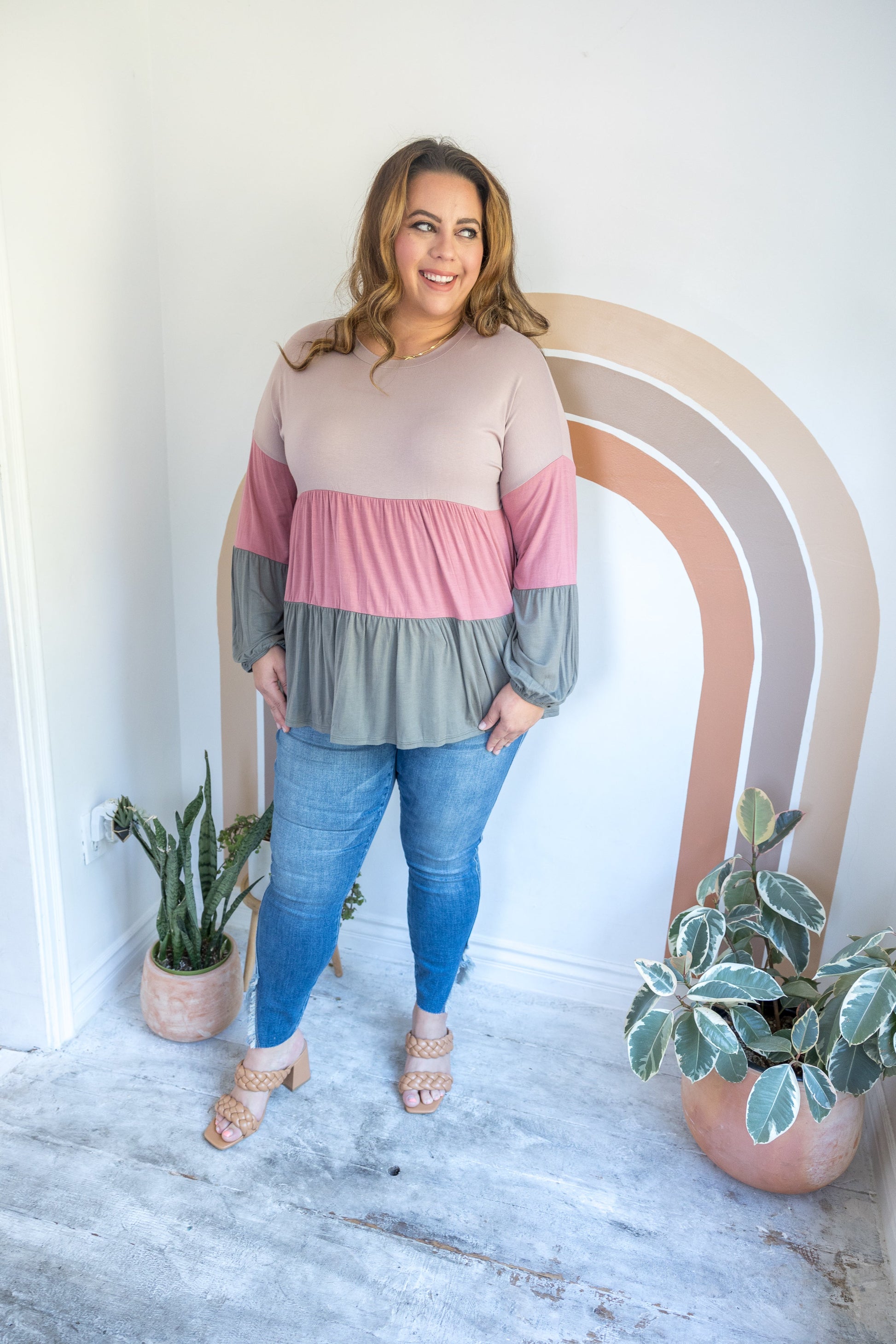 This long sleeve color block top is as sweet as watermelon sugar! With a relaxed fit, this top features a round neckline, long balloon sleeves and rounded hem.