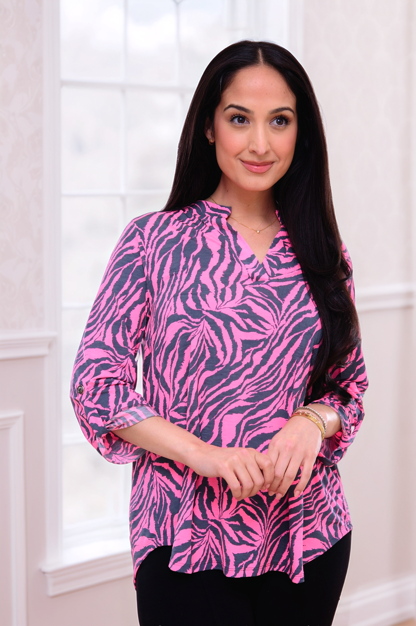 The Wild Stripe Top is perfect for the go-getter who doesn't have time for wrinkles. Made with a luxurious poly blend fabric, this top is lightweight and travel friendly. The relaxed and flowy fit, along with the chic china collar neckline and 3/4" length sleeves, make it a versatile addition to any wardrobe. Go ahead, be wild and stylish with the Wild Stripe Top!